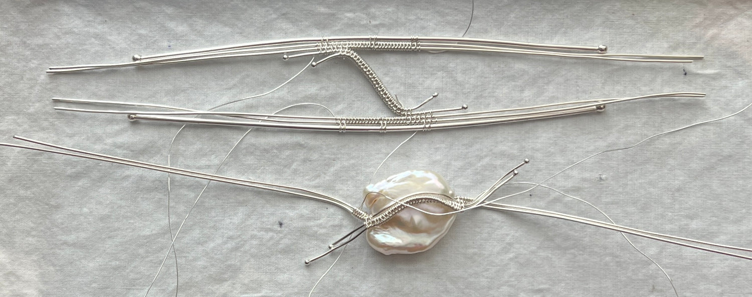 Gentle DreamsIn this example you can see how the silver wire follows the waves of water, the silver bubbles branching out like tree branches as in a dream, and the pale blue from the reflections of the gentle blue sky on the water.