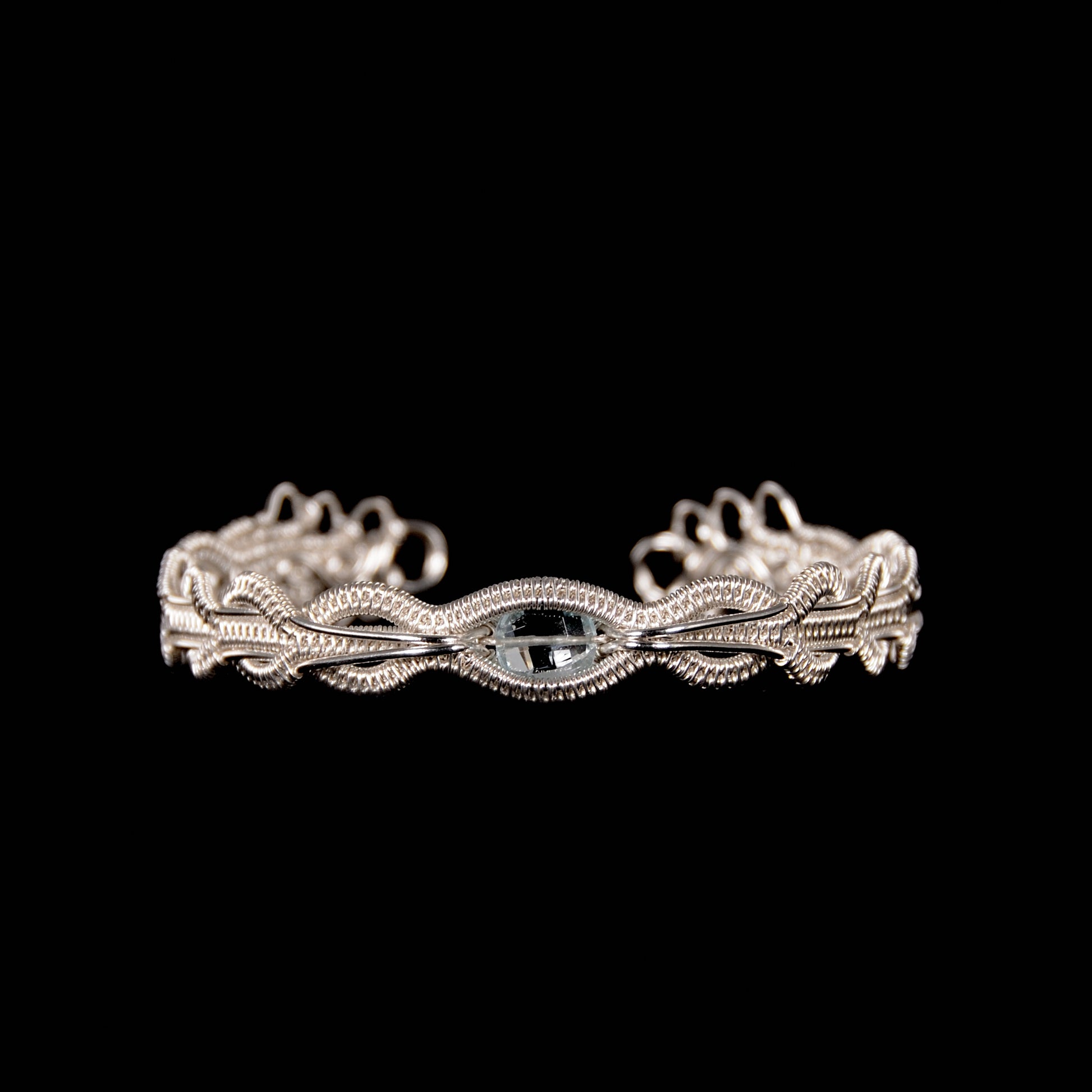 Single, faint, sky blue, topaz gem set against complex, woven, fine silver waves. The stone is set such that it appears almond-shaped although the stone is actually round.