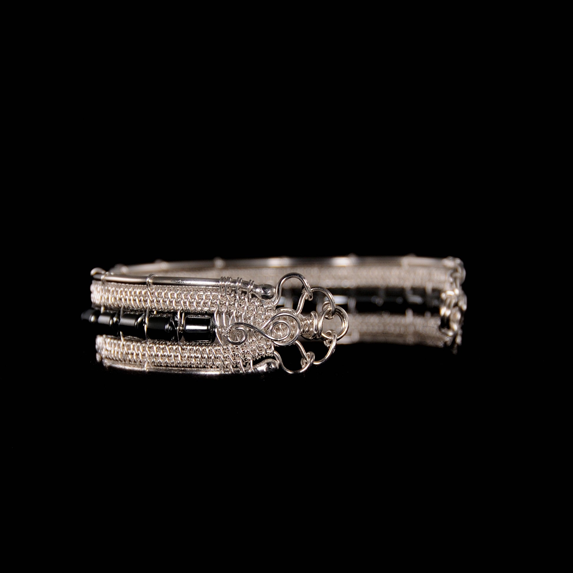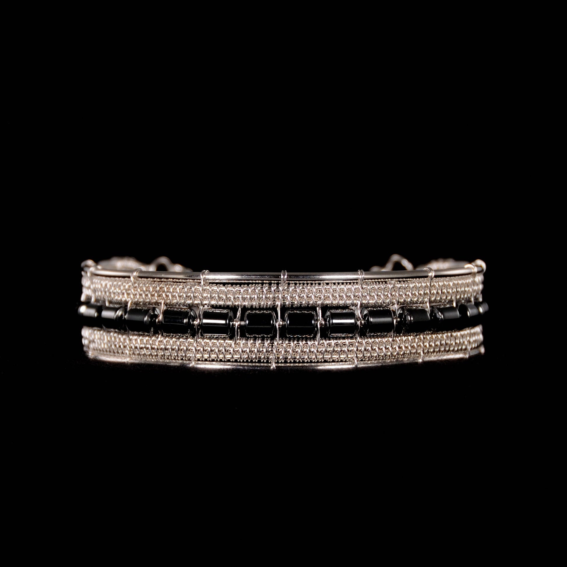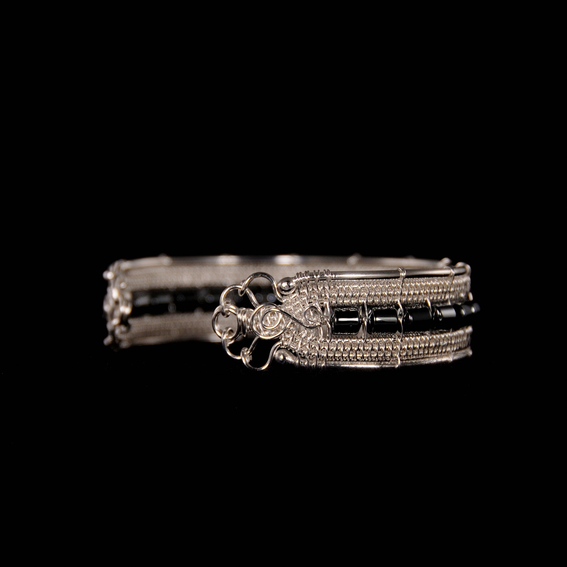 Metallic black-grey hematite bracelet reflecting from the multi-sided, miniature cylinder shapes of the stones superbly complements the silver weaving at the sides.
