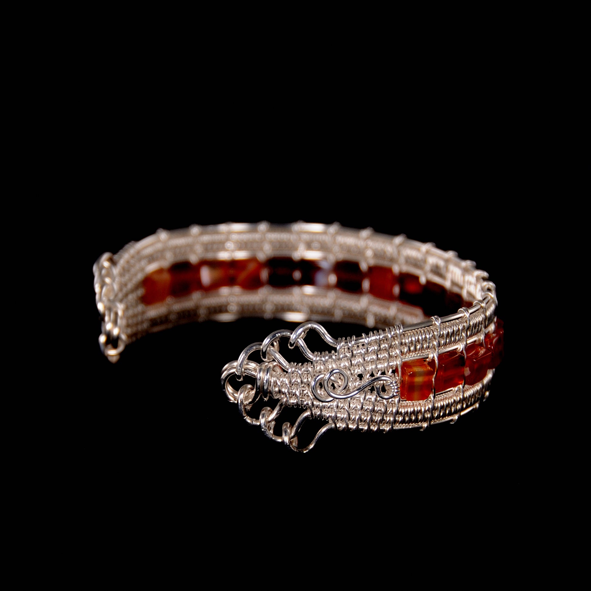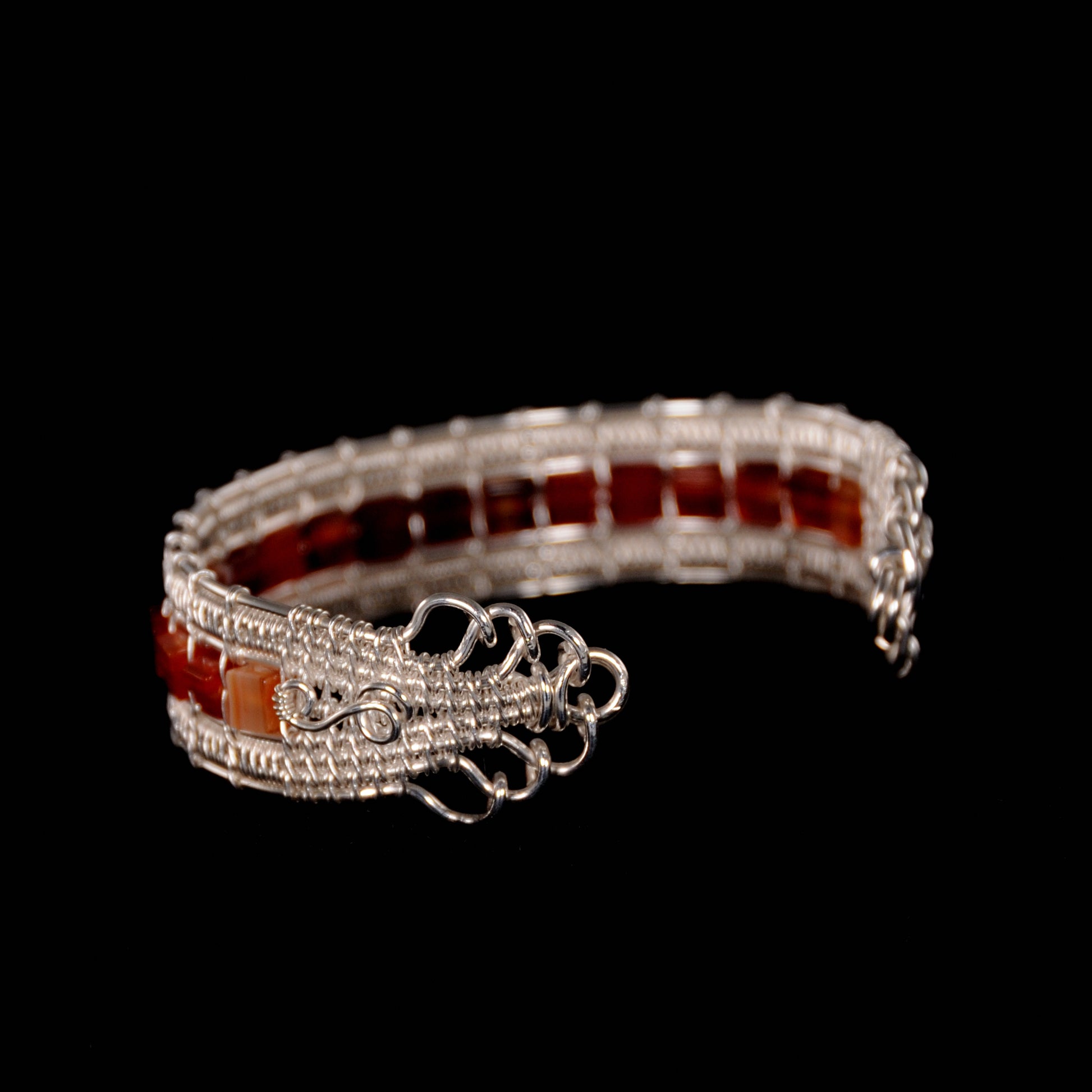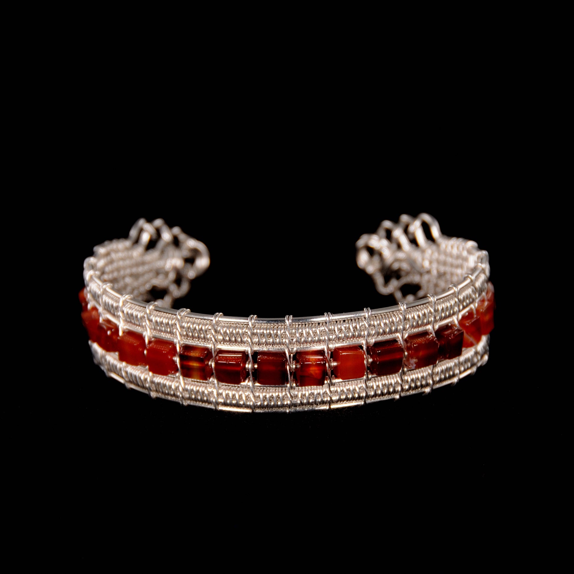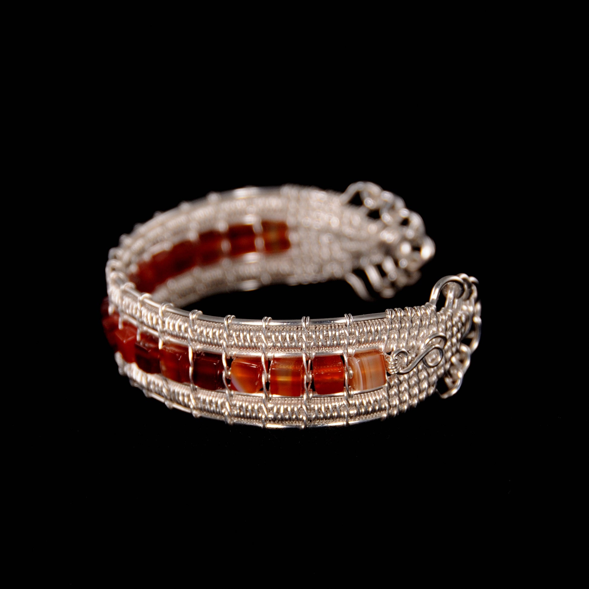 Amazing mix of red, orange and brown agate stone between two bright, woven, fine silver rows.
